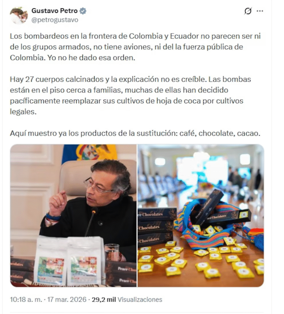 El presidente agregó que las bombas habrían caído cerca de comunidades civiles, incluyendo familias que han optado por sustituir cultivos de coca por productos legales como café, cacao y chocolate, en el marco de programas de sustitución de cultivos ilícitos.