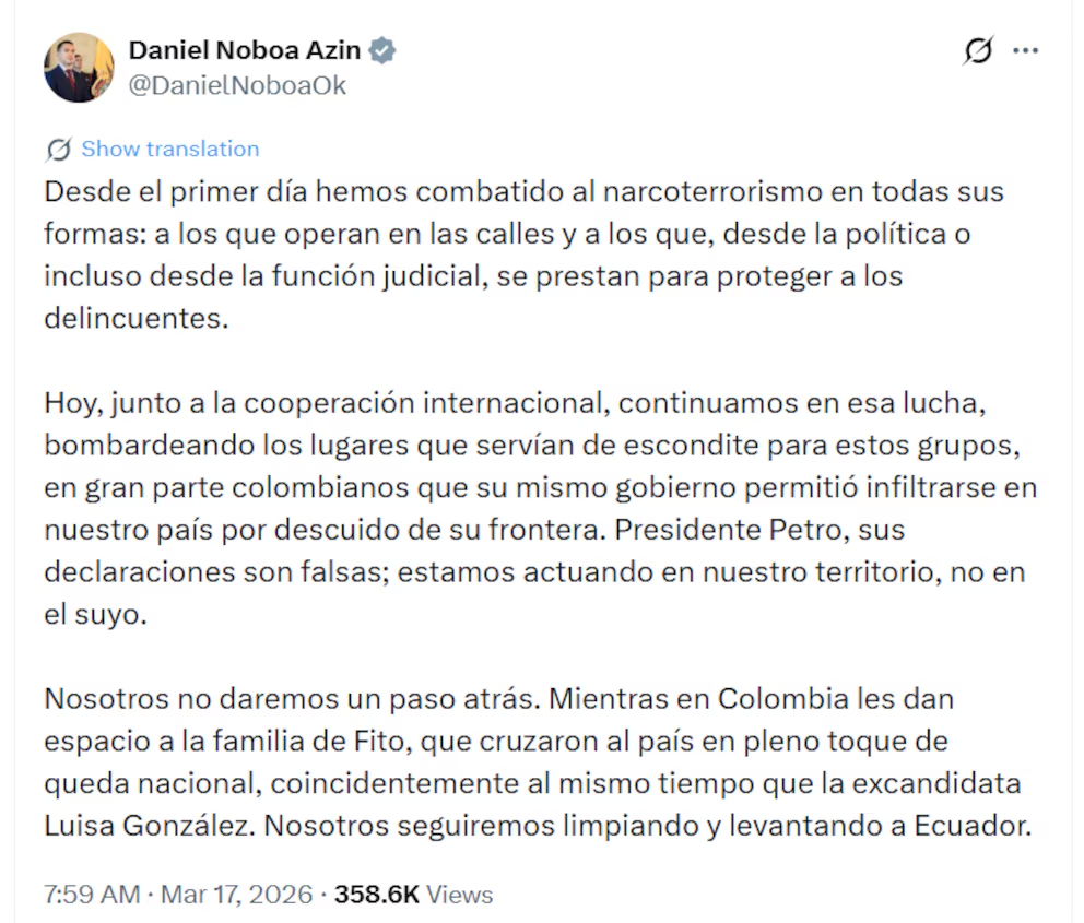Por su parte, Noboa rechazó categóricamente las acusaciones. El mandatario ecuatoriano sostuvo que los recientes operativos se llevaron a cabo exclusivamente dentro del territorio de Ecuador.