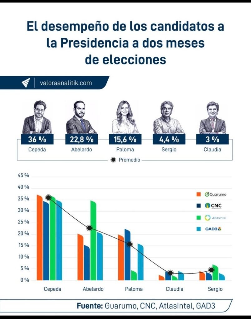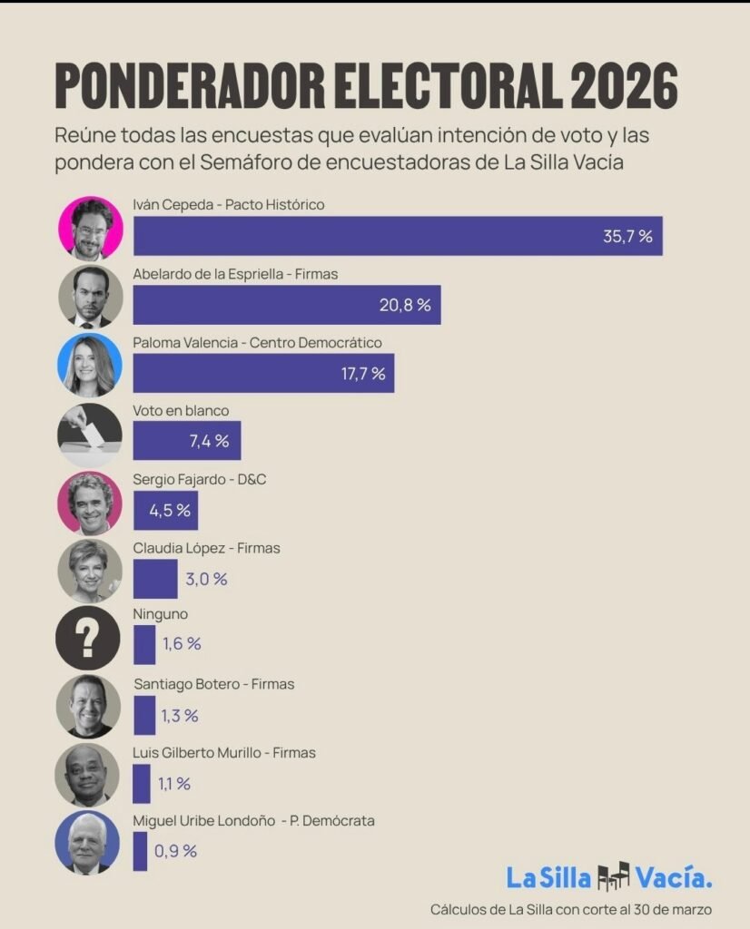 Dos prestigiosos medios de comunicación han publicado los resultados de sus mediciones y ponderaciones sobre las encuestas a la Presidencia de la República: en ambas, Cepeda puntea, seguido únicamente por Abelardo de la Espriella.